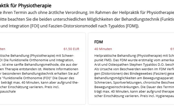 Unserer Online-Buchungssystem hat eine kleine Umsortierung erfahren: Wer ein Behandlung nach der Funktionelle Orthonomie und Integration (FOI) oder eine nach dem Fascien-Distorsionsmodell nach Typaldos (FDM) buchen möchte, findet diese nun unter dem Bereich "Heilpraktik [...]